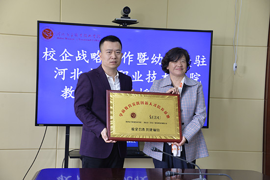 隨后,田久民總經理為我院授予“幼樂美駐河北女子職業技術學院教育研究院”牌匾,袁靜院長為黃士良主任、劉海燕副主任授予“IEDU產教合作聯盟專家”聘書并對我院學前教育系教師進行了技術培訓。