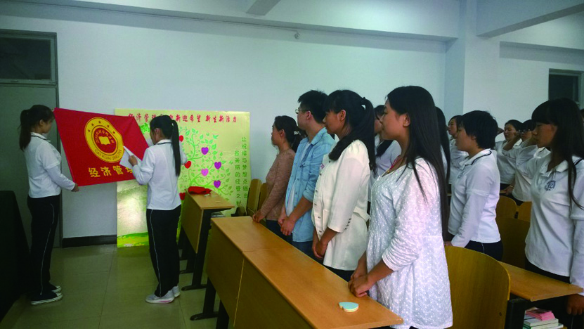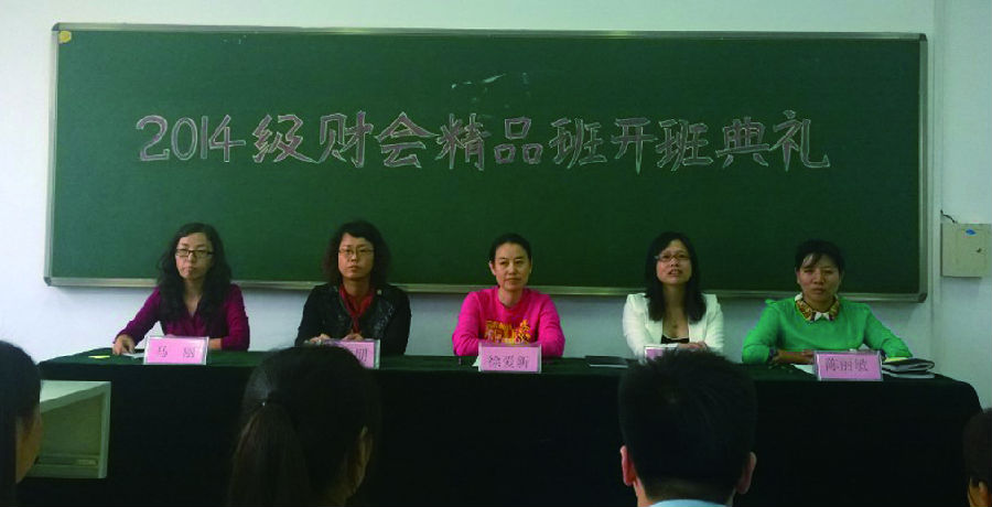 2014年9月25日,經濟管理系2014級財會精品班開班典禮在綜合教學樓505教室舉行。河北女子職業技術學院副院長徐愛新、用友新道河北分公司總裁王立朋、經濟管理系主任李桂榮、團總支書記陳麗敏出席了開班典禮。2014級財會精品班專業導師、會計信息化省賽、國賽指導教師王忖、人生導師李翔、生活導師王偉博、盧宏悅及財會精品班41名同學參加了開班儀式。典禮由經濟管理系副主任馬麗主持。