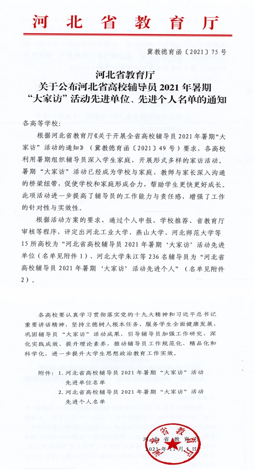 在此項活動中,通過個人申報、學校推薦、省教育廳審核等程序,學院楊丹、李躍兩位教師展現出女院輔導員的較高工作能力和高度社會責任感,榮獲“河北省高校輔導員2021年暑期‘大家訪’活動先進個人”稱號。